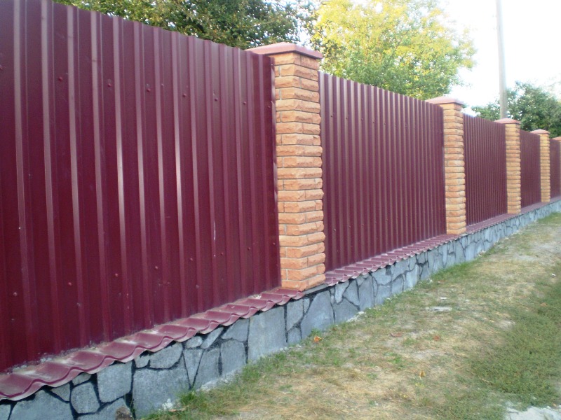 профильных заборов. Сразу, как бетон в основании опор затвердеет, прокопайте небольшой ров для фундамента от столба до столба, дно его заложите гранитным бутом и постепенно залейте. Таким образом, мы сделаем фундамент, дальше осталось соорудить цоколь, на высоту лежачего силикатного кирпича. После того, как все это уже будет крепко держаться, начнем просовывать в Н-образные отверстия, сам забор ставя его на силикатный цоколь. На самом деле, все происходит очень просто и никаких проблем с этим забором не должно быть. Сам процесс подготовки и установки, желательно проводить втроем. Следует отметить, что эти заборы, достаточно обработать грунтовкой, и можете красить их в абсолютно любой цвет. Бетон очень плохо нагревается на солнце, что убережет краску от выцветания.