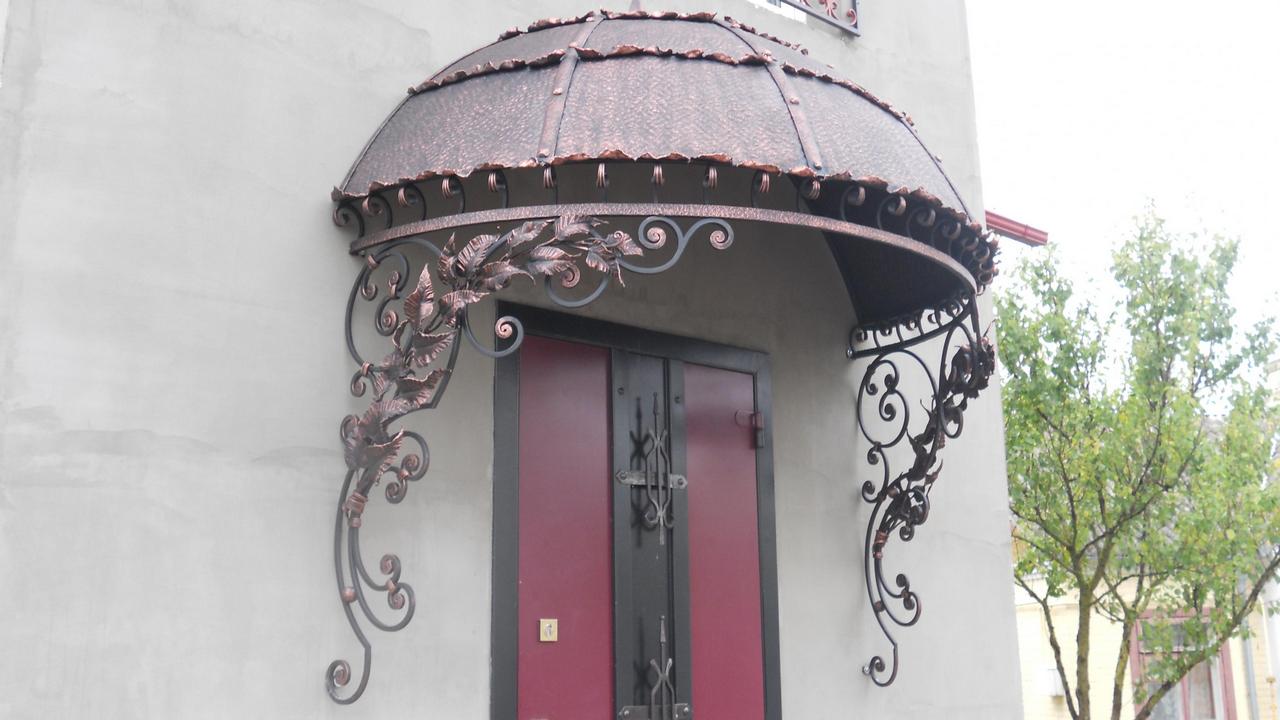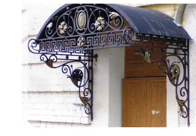Кованый козырек не плавится от жары, не теряет первоначальной формы, не боится даже сильнейшего мороза. Он обладает высокой износостойкостью, не теряет первоначальной формы, устойчив к атмосферным осадкам.