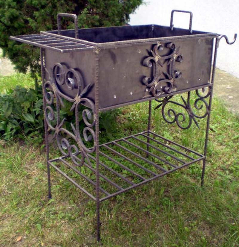 Для изготовления мангала можно применить весь арсенал приемов и стилей по выпуску кованых изделий от простых, в стиле хай-тек, до самых сложных барочных или модерновых. Очень интересно будет выглядеть кованый мангал в строгом готическом стиле из широкой откованной полосы и венчающими топку, с верху и с низу, шарами. Незабываемым получится изделие и в виде паровозика с большими колесами и крышей в виде его кабины. Сейчас в моде кованые мангалы с крышами, защищающими от осадков, стойками которых служат толстая виноградная лоза с обилием листьев и гроздьев винограда. И всё это патинируется в естественные природные тона. Оригинально смотрятся и кованые изделия с использованием животных голов, которые продолжают тело печи. Ну а самыми распространенными всё же остаются маленькие мангалы с небольшими украшающими элементами.